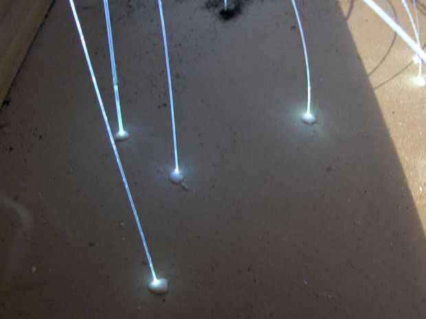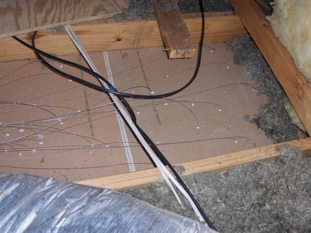 Después de la perforación, puede enhebrar las fibras en los agujeros. Pase casi todo que el camino... tendrás un montón de fibras colgando del techo en la habitación. Finalmente se trata de chatarra de fibra. Déjese un poco de holgura, para gestión del cable y para que dar un poco una vez que usted vuelva a aislar.