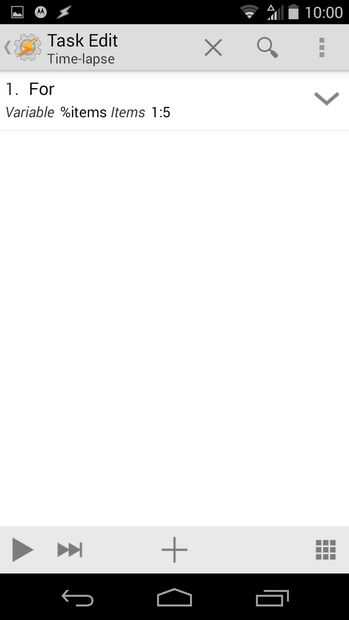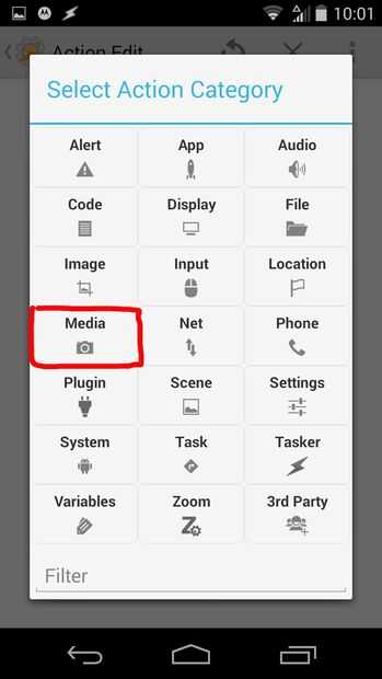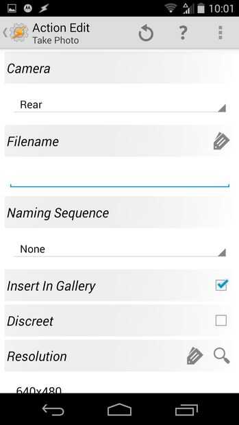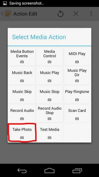 Ahora debe estar en una pantalla que es similar a la imagen 1. Haga clic en el + botón, después elegir los medios de comunicación > tomar una foto. Luego, ajustar la configuración a su gusto, excepto el nombre del archivo. Para el nombre del archivo, debe tener elementos % al final, así que poner artículos de % tl_photo. Esto va a contar las fotos que has tomado. Entonces golpeó hacia atrás.