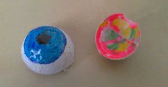Luego dibujar ojos como quieras. Aquí preparé dos ojos azules.-se puede ver en la imagen primera que usé bola de pingpong multicolor de baja calidad para ello!-