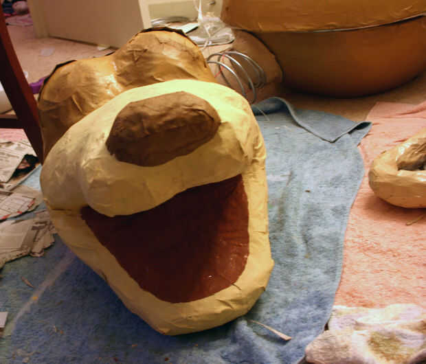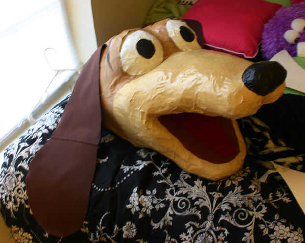 Por último utilicé fieltro marrón para los oídos, que caliente pegado 2 piezas juntas para hacerlas más colocado encima de la otra y corte mi forma deseada (así los oídos estarán cerca de idéntico). También pegamento caliente estas a los lados de la cabeza y cortar una lengüeta de tela roja y pegamento también caliente a la parte posterior de la boca. Para poder ver en este traje también necesitará recortar una gran abertura de la boca y se alinean con los ojos. Para los toques finales, utilice la pintura tan brillante y la misma mezcla que utiliza para las patas para pintar los detalles en su rostro. Usé más pequeños pinceles para los ojos y acrílico blanco y negro. Utilice acrílico marrón oscuro para el interior de la boca y también mod podge todo para conseguir ese look brillante juguete todo otra vez! Pasemos al siguiente paso!