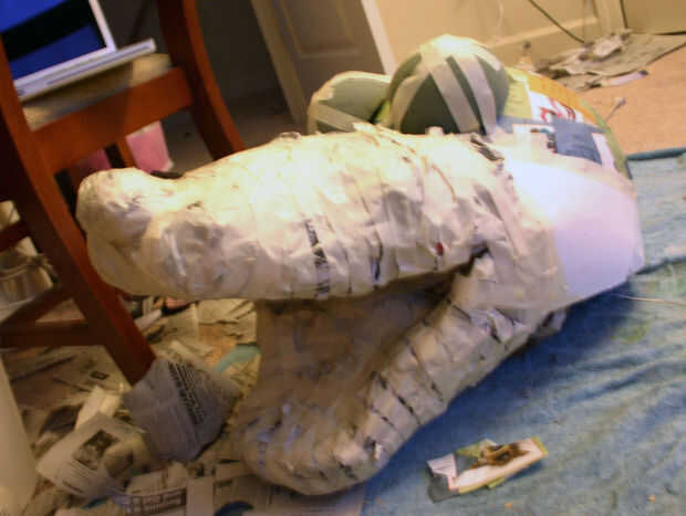 Así, que empecé a formar la boca y los ojos de la misma forma que hice para las patas. También usaba cantidades muy grandes de periódico y cinta adhesiva para cara de Slinky, pero esto resultó para ser demasiado pesada para levantar su propio! Entonces me di cuenta de la basura puede tapa sería perfecta para ayudarme a levantar la parte delantera de la cabeza y se mantuvieron en papel maché después de todo! Supongo que puedo decir realmente tuve suerte, pero a la larga ahora tengo que comprar un nuevo bote de basura! Una vez había terminado de moldear su cara y ojos también puse toallas en la parte posterior de la tapa para dar más equilibrio a la cara pesada así que sentaba sobre mi cabeza uniformemente. Yo entonces papel mache rostro como lo hice con todo lo demás.