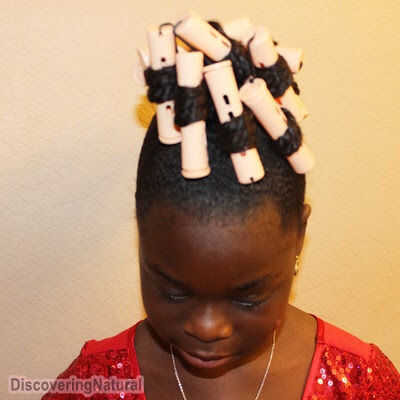 Trabajando en la parte superior, tome una porción pequeña de cabello, aplicar Mousse de cabello Natural de Giovanni y luego gel Eco Styler.