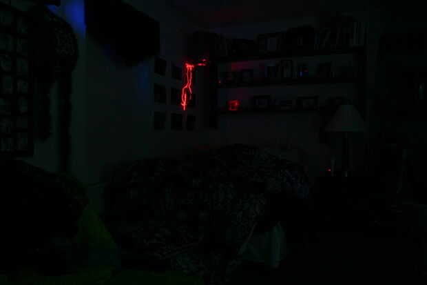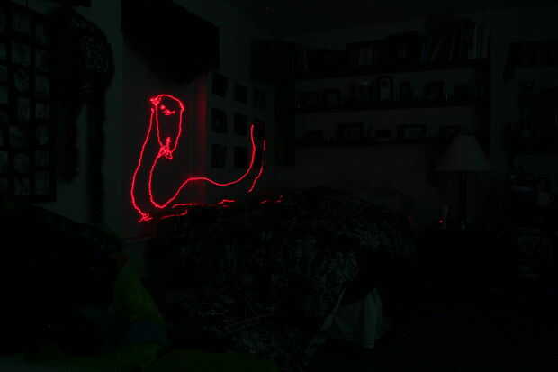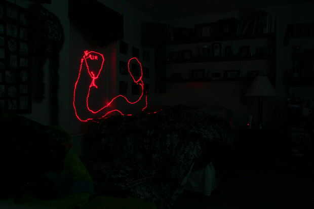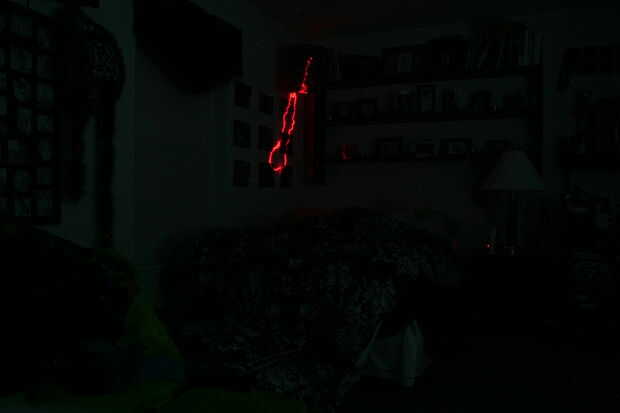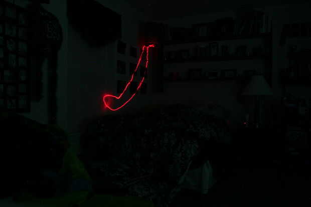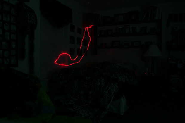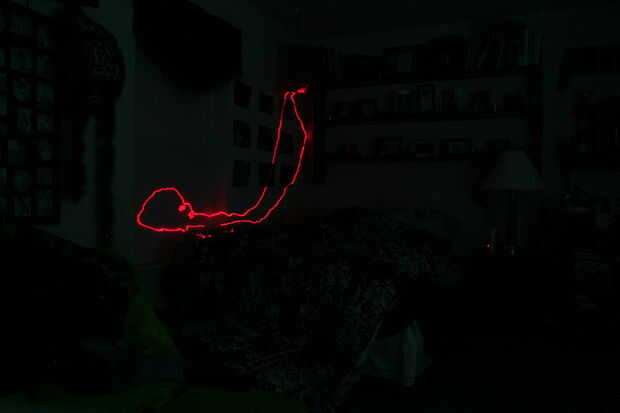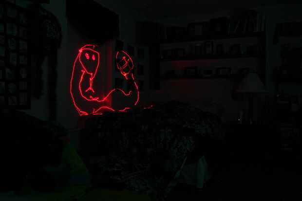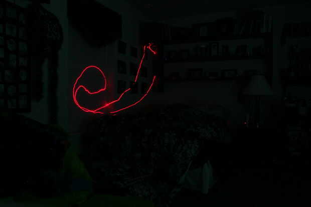 Cualquier fotos que contienen ambos el blanco luz y personajes de luz de láser rojo fueron creados en la misma forma pero ambos al mismo tiempo. Por lo tanto la velocidad de obturación sería 30 segundos, pero fue mucho más difícil dibujar con una luz y luego el otro en sólo 30 segundos. Se trata de donde vendría práctico para tener un control remoto para que pudieran tomar su dibujo de tiempo y ajustar el obturador una vez que fueron acabados. Tomó algo de práctica pero finalmente era lo suficientemente rápido como para dibujar tanto en esa pequeña cantidad de tiempo!