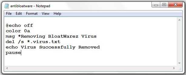 Seguir adelante y probar el virus - bloatware.cmd y una vez haya creado el virus, utilice el antibloatware.cmd para eliminar los archivos. Descargar AntiVirus archivo y utilizarlo para su placer.