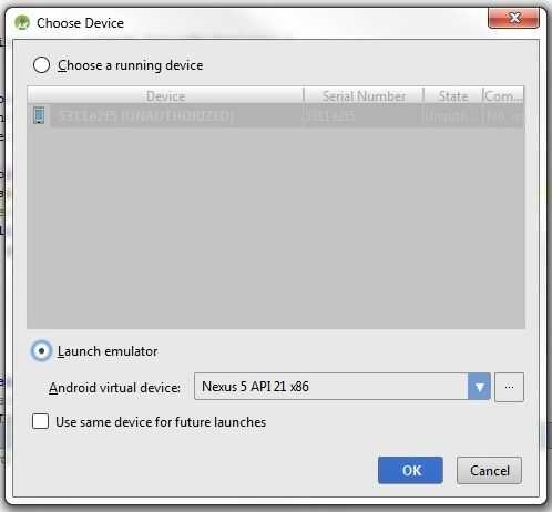 2. Cuando el apperas de diálogo "Seleccionar dispositivo" (esto puede tardar unos instantes), seleccione la opción "Lauch emulador".