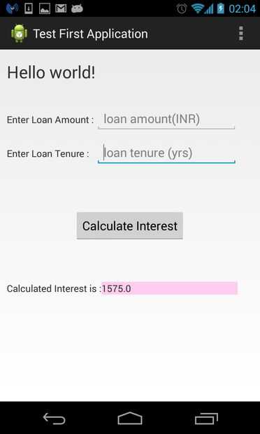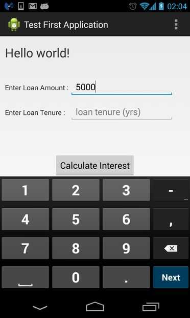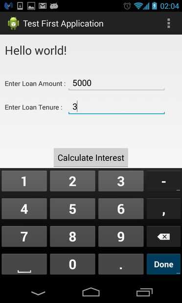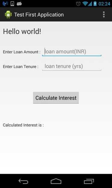 - Ahora para ejecutar la aplicación, vaya a Run -> Ejecutar como -> aplicación para Android. Esto carga la aplicación en el emulador y se inicia la aplicación como se muestra a continuación. Lo anterior es la primera pantalla.