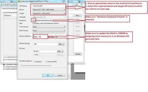 - Configurar el AVD apropiadamente como se indica en la imagen siguiente.