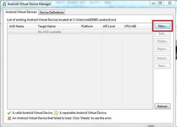 - Haga clic en el botón "Nuevo" para crear un nuevo AVD