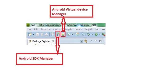 Por ahora, que simplemente lo ejecute en el emulador. Pero antes de ejecutar la aplicación, primero debemos crear un Android Virtual dispositivo (AVD) mediante el administrador de SDK de Android proporciona con el paquete de ADT. Compruebe la pantalla a continuación para localizar Android SDK Manager en Eclipse.