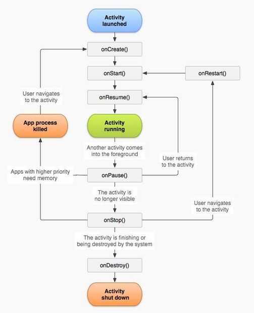 Como se mencionó anteriormente, una 'actividad' es la pantalla que el usuario ve cuando carga la aplicación. Un usuario puede moverse de una actividad a otra en el transcurso del uso de la aplicación. Y así, cada actividad pasa por muchos Estados diferentes a lo largo de toda su vida. Los siguientes son los Estados de ciclo de vida de la actividad.