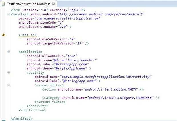 Como se mencionó anteriormente, el archivo AndroidManifest.xml contiene la declaración de todos los elementos/actividades/permisos que la aplicación actual define y utiliza. El archivo AndroidManifest.xml para nuestro proyecto actual es como se muestra arriba.