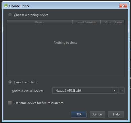 7. Repita los pasos 3 de correr en un dispositivo real y en la ventana Elegir dispositivo, seleccionar el emulador que acaba de crear y haga clic en Aceptar.