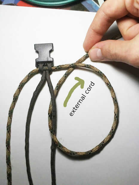 En primer lugar, tomar el cable externo, en el lado derecho y hacer un lazo a la cuerda cerca, pero no atar totalmente.