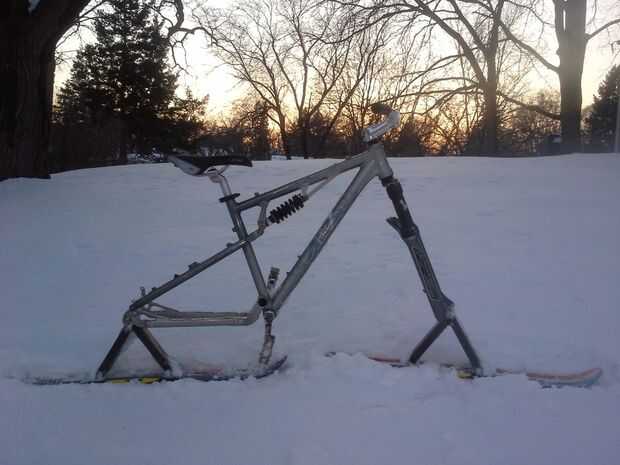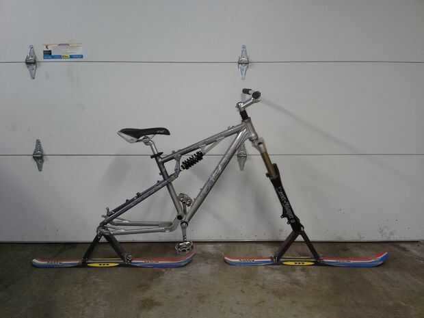 Durante sus días como una bicicleta de montaña regular, la estructura del esquí-bicicleta 2.0 tenía una horquilla con 100 mm de recorrido. Al convertir a Ski-moto 2.0, reemplacé el tenedor original de un tenedor con 130 mm de recorrido. La horquilla de 130 mm tenía 30 milímetros más de recorrido de la horquilla de 100 mm y por lo tanto era más largo. Este aumento de longitud levantó el tubo de dirección y reduce el ángulo del tubo de dirección que me dio más confianza de dirección y control cuando cuesta abajo.