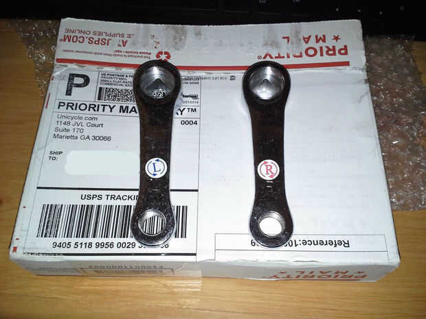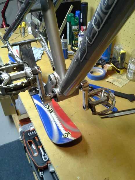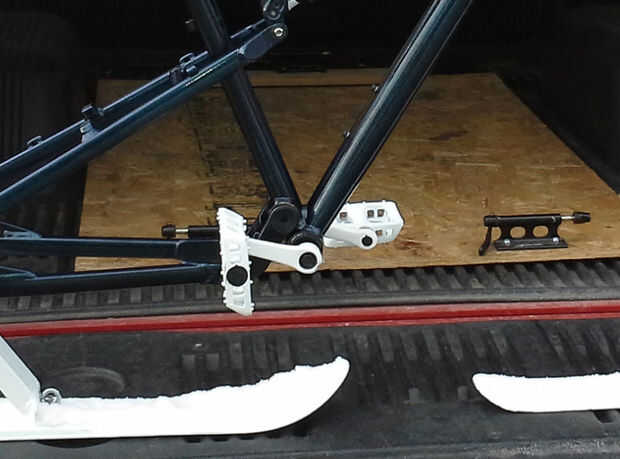 Para Ski-moto 2.0, se me ocurrió la idea de utilizar brazos de manivela de monociclo. Biela de monociclo funcionó muy bien porque todavía permitían a los pedales cambiar la posición, no tenía anillos de cadena que preocuparse y estaba disponible en una variedad de longitudes. Decidí usar realmente corto brazo de biela para remediar la incómoda sensación de pedaleo largo de biela con cero resistencia. Tiene manivela corta brazos resultaron de un diámetro mucho menor rotación del pedal, minimizar los efectos de giro de las manivelas con cero resistencia. Otro beneficio de biela más corta era la mayor separación con respecto a la tierra.