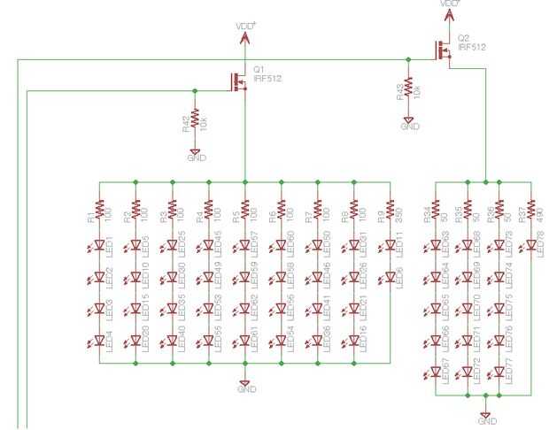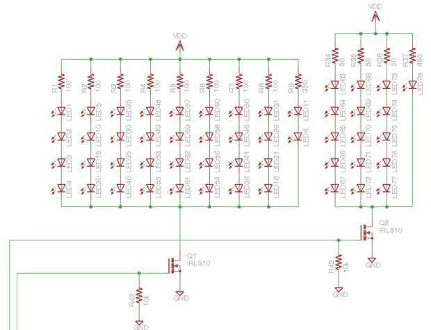El error es publicado en las fotos a este paso, pero sucedió porque tenía los LEDs conectados a la fuente de la IRL510 y luego a tierra. Ahora pensé que esto debería funcionar, pero por alguna razón cuando proveería + 5v del PIC a la puerta de los MOSFETs, los MOSFETs no permiten suficiente corriente a través de y los LEDs no encienden. Salió un protoboard y me comenzó a tratar de averiguar por qué no funciona. Entonces lo conecté hasta para que los LEDs fueron conectados al desagüe de los MOSFET y listo! Cuando le pongo + 5v en la puerta de cualquiera de los dos IRL510, su LED correspondiente se enciende. Debo haber cableado esta manera desde el principio.