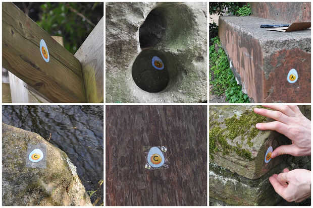 Una vez impreso encontramos la mejor apuesta era dibujar las letras en marcador permanente y sellar los huevos con celo para protegerlos de posibles lluvias. Para superficies planas, lisas como ladrillo y piedra, las etiquetas de trabajan un placer. Si desea ocultar los huevos en los árboles, puede 'laminado' el huevo con unos trozos de cinta adhesiva y luego usar chinchetas o tachuelas para fijar a una rama o tronco. Árboles de adulto no son dañados por este, pero no se peguen los pasadores en ciernes árboles del bebé como la madre naturaleza no le gusta!