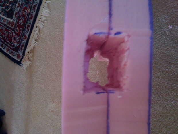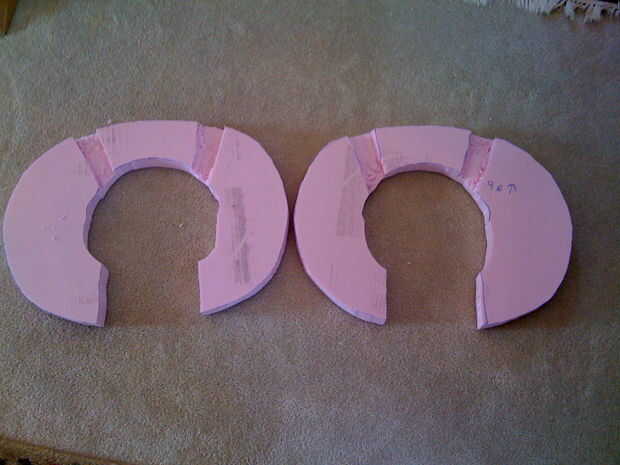 Uno por uno, recortar el espacio para la cabeza. Al hacer esto la primera vez, hacerlo apretado en la cabeza. Siempre puede cortar más tarde. Si se corta demasiado en este paso tienes que desechar la pieza y rehacerlo. En estas fotos corte un espacio mucho más grande que mi cabeza. Lo hice para hacer espacio para un casco de construcción (verá en un paso posterior). Corté también espacio para ventiladores que quieras si va a usar para cuatro o más horas sin quitarse.