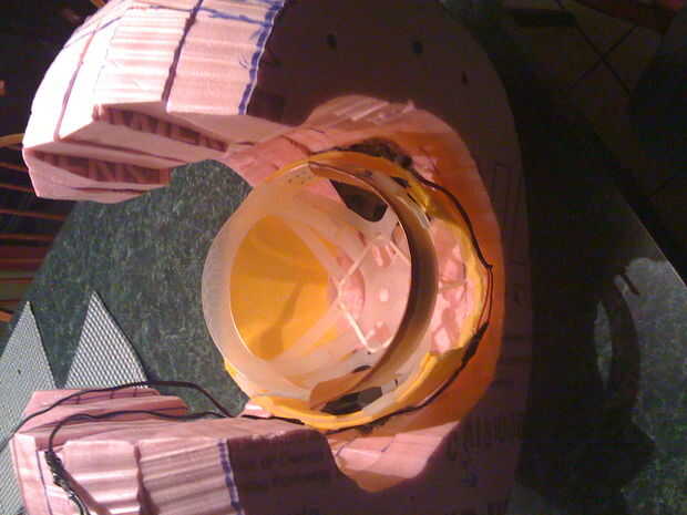 Montar la base uniendo las secciones medianas juntos. ADVERTENCIA más pegamento derretirá la espuma. Afortunadamente, llano viejo Elmers pegamento funciona muy bien. También usé 3 tornillos para unir las piezas mientras se seca el pegamento. Asegura que permita al menos 24 horas para que el pegamento se seque. Si desea puede instalar un casco de construcción (como un muy buen soporte de la cabeza) y ventiladores. Para ventiladores usé viejos ventiladores de PC conectados a baterías de 9 voltios (lo siento no tengo una foto pero se pueden ver los agujeros para los ventiladores). Asegúrese de que cabe y es cómodo antes de ir hasta el montaje final.