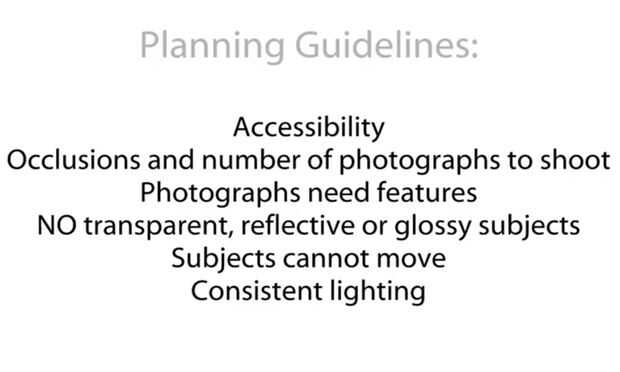 - evitar superficies altamente reflectantes, brillantes o brillantes - no se puede representar correctamente. Terminarás con los agujeros en el modelo o faltarán todos lados!