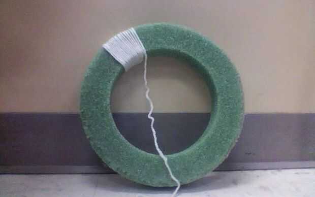-También, en lugar de tratar a todos su hilo alrededor de la forma de guirnalda lazo, usted debe cortarlo en alrededor de 3 pies tiras largas, haciéndolo más fácil de envolver. Al llegar al final de una tira, encolado (junto con pegado el principio de la tira hacia abajo y periódico pegado mientras usted).