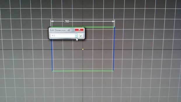 Ahora vamos para acotar nuestro objeto al tamaño que queramos. Nuestro rectángulo va a ser 4.5 "x 2,5". Seleccione el icono de la dimensión en la parte superior de la pantalla y mueva el cursor sobre la línea superior del rectángulo. Se volverá blanco. Haga clic en mover el cursor colocar la línea de dimensión. Introduzca el tamaño deseado en el recuadro y haga clic en el check verde. Repita para la línea vertical también. Usted debe terminar con un rectángulo azul 4.5 "x 2,5".