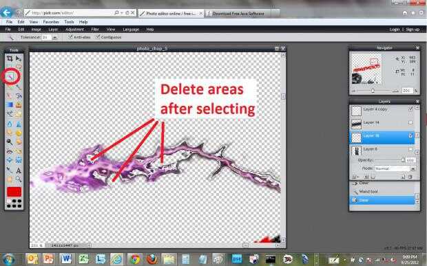 Utilice la herramienta "varita mágica" para seleccionar las áreas oscuras del arco y comenzar a borrar todas estas regiones. Una vez que ha hecho un corte áspero ir detrás con la herramienta Borrador y tenga cuidado de borrar los detalles más finos.