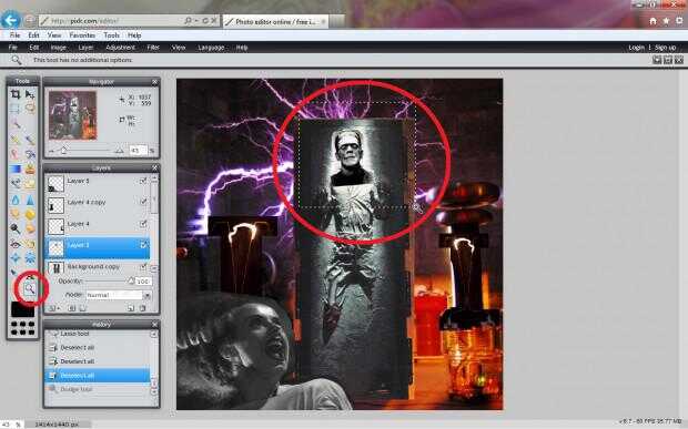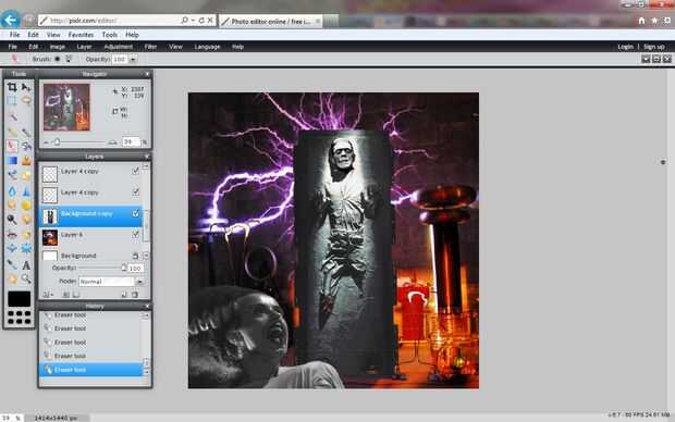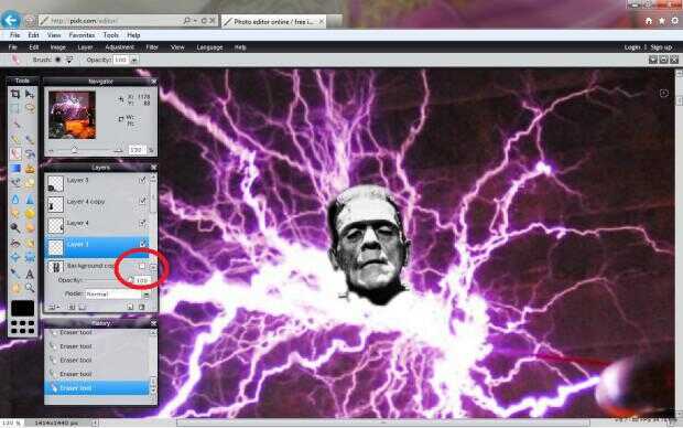 Ahora utilice la herramienta Borrador y un cepillo que se descolora radialmente desde el centro y comenzar a "borrar" los píxeles extras de alrededor del componente lentamente. También es útil desactivar las capas de fondo visibles para una mayor precisión. Tenga cuidado de no borrar demasiado o demasiado poco para hacer la mezcla perfecta.