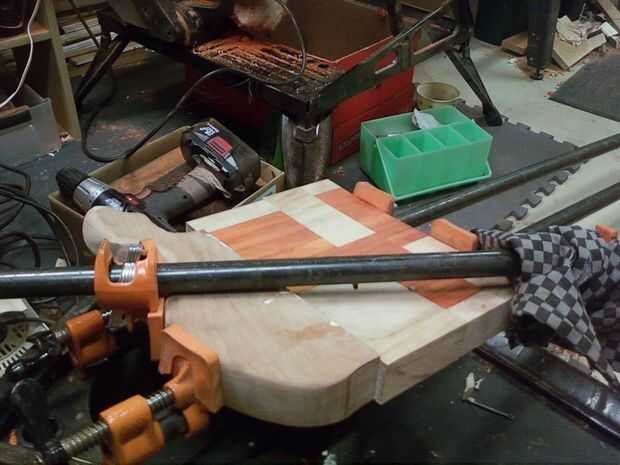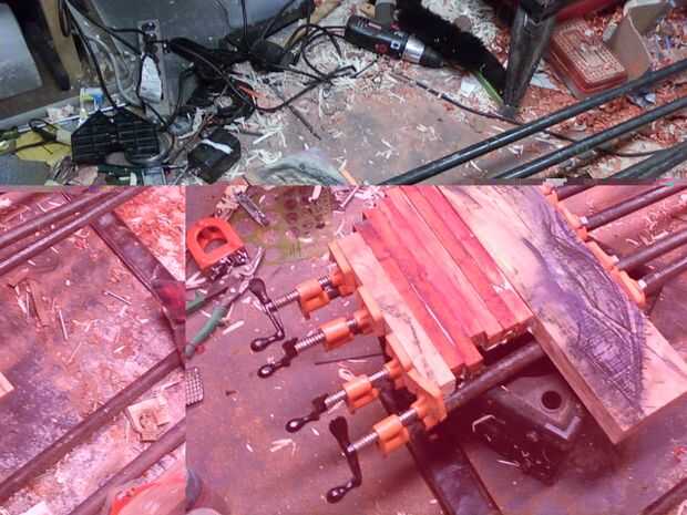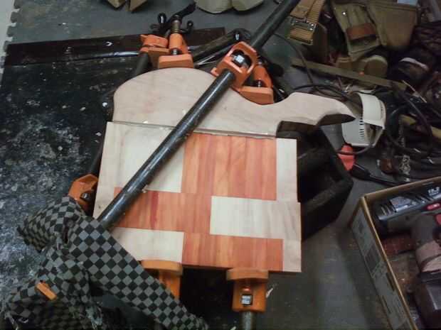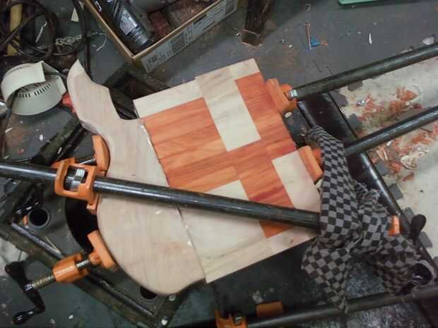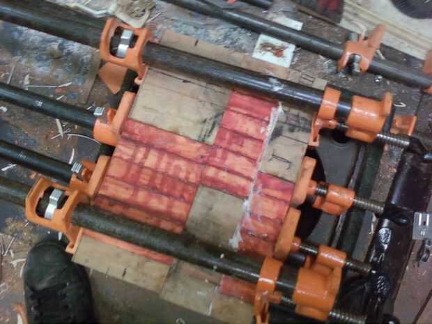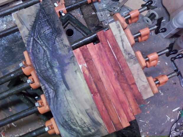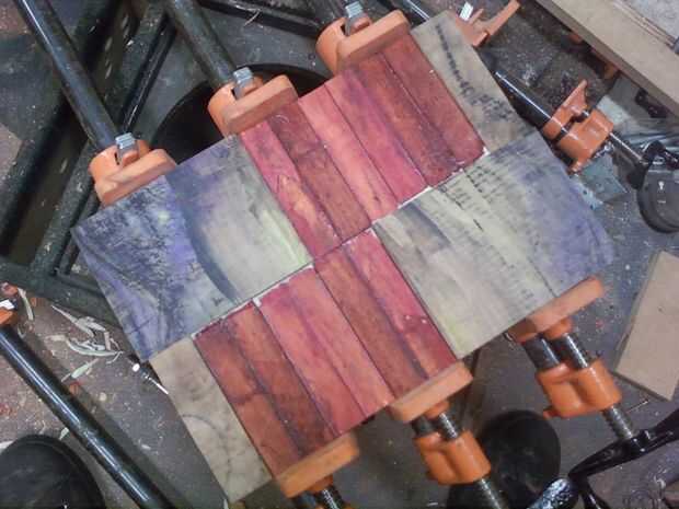 3. luego pegué el resto arce rojo de crear el cuerpo original de las piezas de Padauk. Estos quedaron en abrazaderas para 1 día.