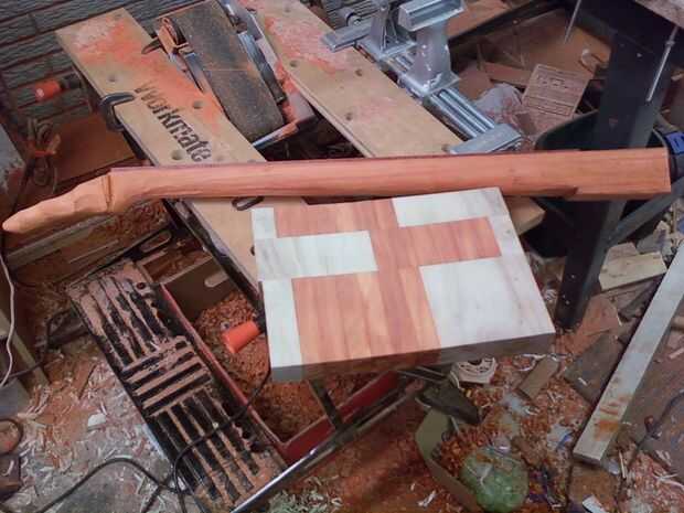 1. decidí reutilizar una parte de mi cuerpo original de la guitarra baja para el lado izquierdo. Corté el final que quise usar del cuerpo original usando una sierra de vaivén.