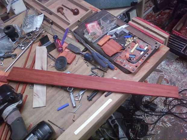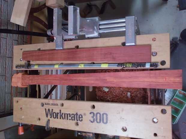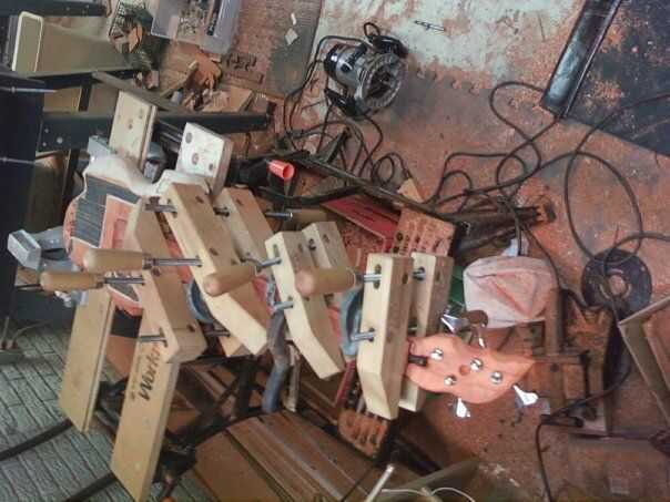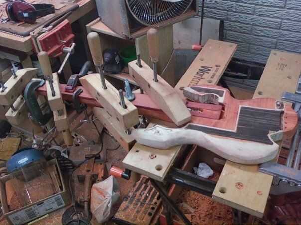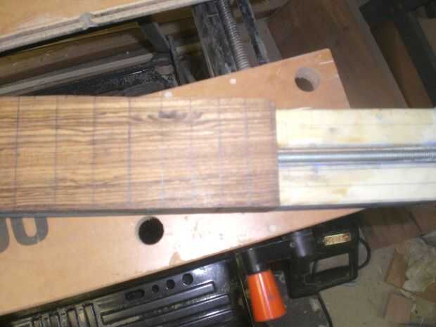 Con una sierra de cinta con cuidado corta la forma del diapasón. (recuerda dejar un pequeño espacio para errores.) A continuación utilice papel de lija o una lijadora orbital para limpiar los lados. Tomar su nuevo diapasón y laminado en la parte superior del cuello. Asegúrese de que ha instalado su alma en el cuello antes de pegar y vigilar el alma para asegurarse de que cualquier pegamento no accidentalmente fijar en la cavidad de barra del braguero. Si utiliza demasiado pegamento cuando se encole en el mástil y se queda su alma te prometo que no es un campista feliz.