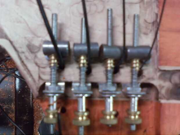 Para los 4 tuning cabezas de la máquina ubicar su posición en el cabezal. Perfore 4 orificios del cabezal para alojar el eje cilíndrico que se unen las cuerdas graves a. Montar los 4 tuning cabezas de la máquina en el cabezal de la parte inferior de la cabeza.
