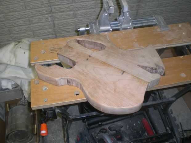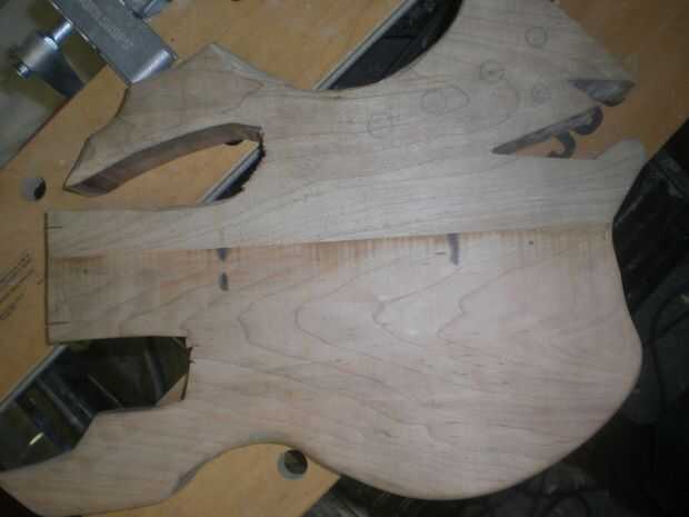 3. cuando el diseño se pone hacia fuera usted puede empezar a cortar. Para la corte he utilizado una sierra de cinta con una cuchilla de corte de madera más gruesa con dientes más grandes. El arce rojo utilicé es una madera relativamente dura así que la hoja más grande para cortar con mayor facilidad. Para reducir la tensión en la hoja al cortar cortes hacia adentro hacia el cuerpo y lo hizo a lo largo de cada lado. Esto hizo mucho más fácil para cortar curvas y poder extraer madera más fácil.
