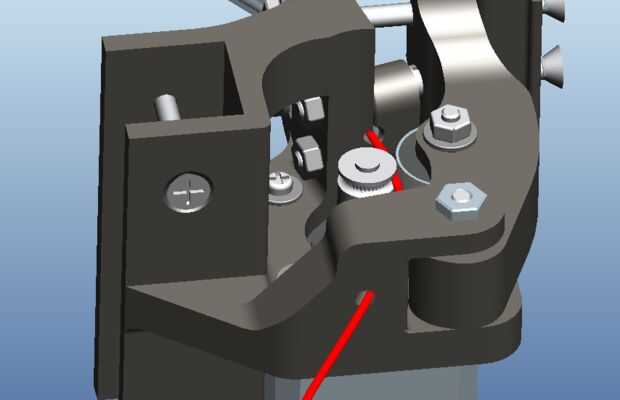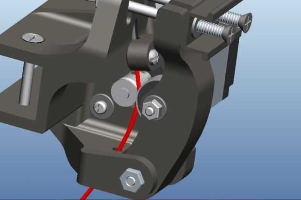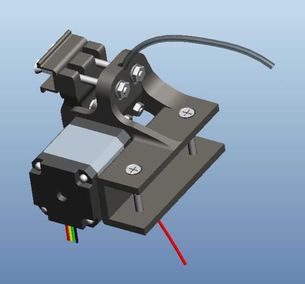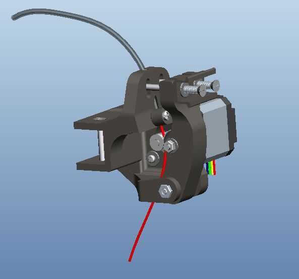 La Asamblea de la extrusora que se muestra ofrece una sección de filamento de fácil acceso cerca de la zona motor. Esto ayuda en la carga del nuevo filamento. El soporte también cuenta con guías de filamento incorporado, para evitar que el filamento vagando fuera de la ruta. Otra característica de este, es un tubo de accionamiento único sistema de sujeción. El tubo de accionamiento está asegurado en el soporte con el uso del fichero .stl "bowdentubeclamp".