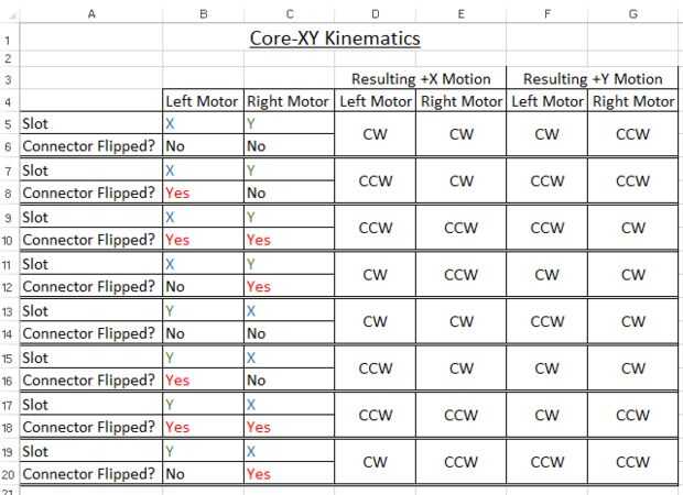 Debido a la naturaleza del cableado hasta el tablero de rampas, te recomiendo utilizar uno de los muchos guías detalladas en línea. Este proceso es muy sencillo y ha cubierto muchas veces elseware. He proporcionado una "tabla de verdad" de las clases, que generé para solucionar el mal movimiento provenientes de la aplicación de CoreXY corriendo firmware Marlin. La categoría de "Conector movido de un tirón", se refiere a la forma que tenía mi motores conectados al tiempo. Debo señalar que una vez más, hay un patrón a la carta, sin embargo la orientación de asignado a "volteado" o "no volteado" no sean iguales que los suyos. Para la referencia, en el momento de hacer la tabla, había asignado los conectores motores derecho e izquierdos como "no volteado" cuando el extremo abierto del conector (el lado donde se pueden ver los pernos a través del lado), se enfrentaba a los disipadores de calor motor paso a paso.