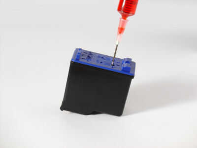 Usar las jeringas de aspirar la mezcla de la fragancia/de tinta a inyectar en los cartuchos de tinta de color correspondiente.