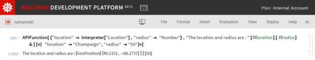 APIFunction [{"location" -> intérprete ["ubicación"], "radio" -> "Número"}, "la ubicación y el radio son:" [#location] [#radius] &] [< | " situación"->"Chamán","radio"->"50"| >]