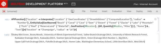 APIFunction [{"location" -> intérprete ["Ubicación" | "GeoCoordinates" | "StreetAddress" | "ComputedLocation"], "radio" -> "Número"}, EntityValue [GeoNearest ["Playa" | "Canal" | "Cueva" | "Presa" | "Desierto" | "Bosque" | "Glaciar" | "El lago" | "Montaña" | "Parque" | "Arrecife" | "ReserveLand" | "Cascada", geoposición [#location], {cantidad todos, [#radius, "Millas"]}], "Nombre"] &, "Texto"] [< | " situación"->"Chamán","radio"-> «20» | >]