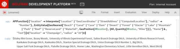 APIFunction [{"location" -> intérprete ["Ubicación" | "GeoCoordinates" | "StreetAddress" | "ComputedLocation"], "radio" -> "Número"}, EntityValue [GeoNearest ["Playa" | "Canal" | "Cueva" | "Presa" | "Desierto" | "Bosque" | "Glaciar" | "El lago" | "Montaña" | "Parque" | "Arrecife" | "ReserveLand" | "Cascada", geoposición [#location], {cantidad todos, [#radius, "Millas"]}], "Nombre"], "Text"] [< | " situación"->"Chamán","radio"-> «20» | >]