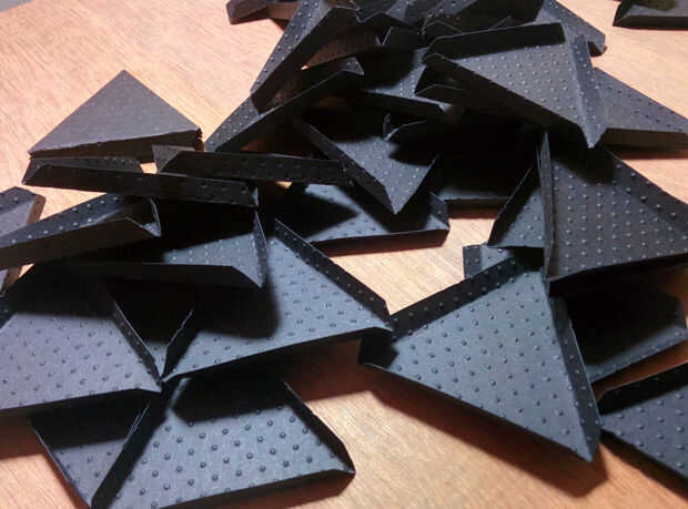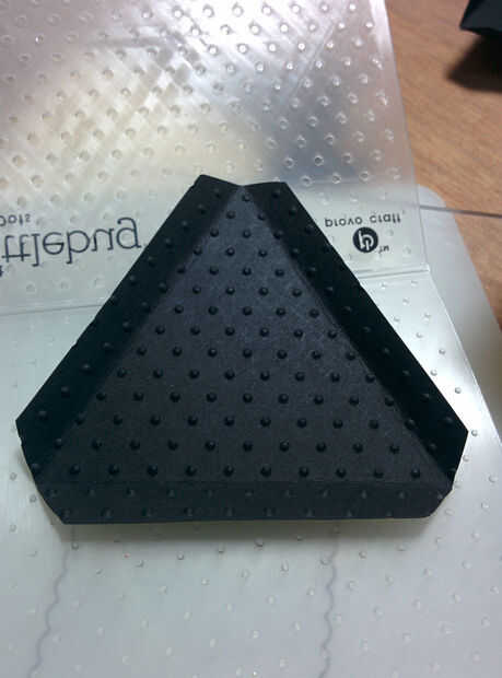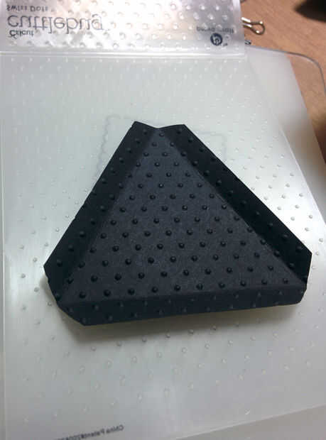 Tenemos que realza los puntos de Suiza en estas piezas del triángulo. Tal vez se pregunte si debo haber hecho esto antes el plegamiento. La razón que lo no hice es evitar presionar y dañar la superficie en relieve, también los puntos de relieve podrían haber llevado a pliegues incorrectos.