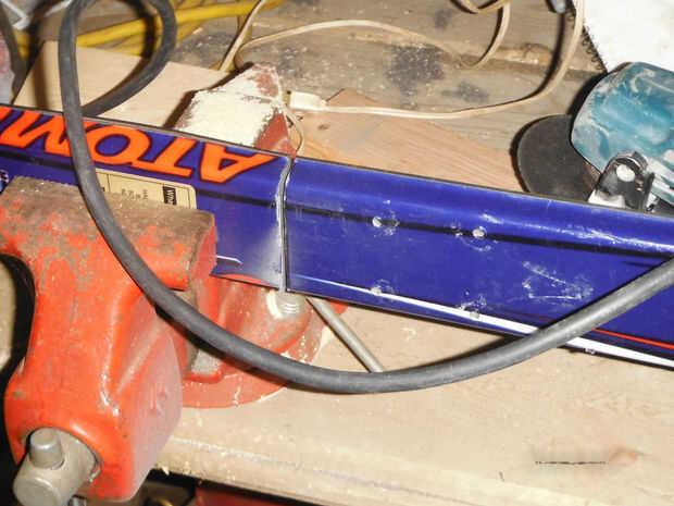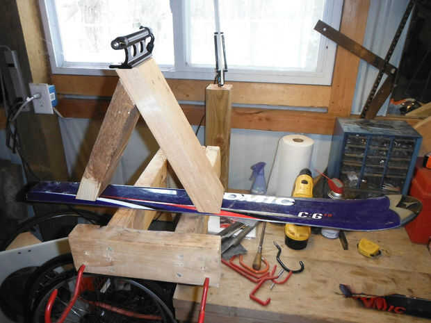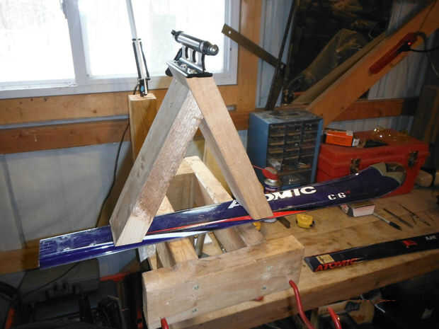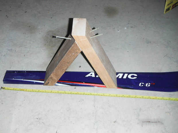 El montaje de la horquilla fue diseñado para sentarse en la parte superior del soporte de montaje y el resto de la base se construyó utilizando trigonometría y un serrucho para cortar los ángulos precisos. El 2x4s era más ancha que los esquís para eliminar cualquier saliente de la 2x4s medido cuánto estaba en cada lado de la 2 x 4 y luego utiliza la ingletadora Sierra para cortar una conicidad en cada lado. El soporte de montaje delantero requiere dos piezas de madera para crear la base triangular. Taladré agujeros en 2x4s para evitar que la madera se agriete. Tornillos de la cubierta fueron conducidos en la madera para fijar la base juntos seguida por el montaje de la horquilla sobre la base.