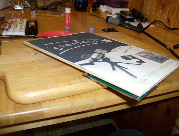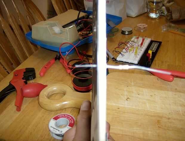 En este punto también puede conectar el microcontrolador a la espalda, preferiblemente en una fuera de la ubicación de la manera como una esquina. Ya que estaba preocupado por el peso de mi micontroller siendo un problema, me encontré un alambre por los agujeros en el tablero, a través de unos agujeros en el masonite que perforé y regresar al principio donde soldado a sí mismo. No conseguí una buena foto de este, pero es probablemente como era excesiva y cinta probablemente trabajaría mejor en fin.