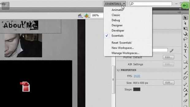 Iniciar el programa Adobe Flash CS4 y abrir tus archivos de sitios web Flash. Cambiar el diseño del espacio de trabajo haciendo clic en el cuadro de lista desplegable en la parte superior izquierda de la barra de menú y seleccionando diseñador.