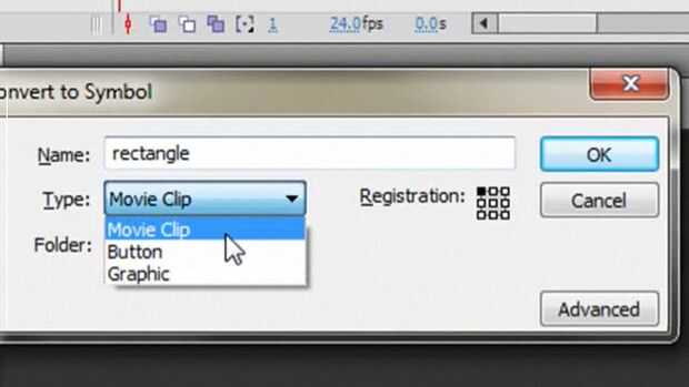 Dar una descripción general de la StepClick el centro del rectángulo y pulsa F8 para convertirlo en un símbolo también. Cambiar el nombre a rectángulo y cambiar el tipo de Clip de película. Para el registro, seleccione la Plaza del centro en el extremo izquierdo. A continuación, haga clic en Aceptar. Ahora vaya al panel de propiedades y cambiar el nombre de instancia rectangle_clip.