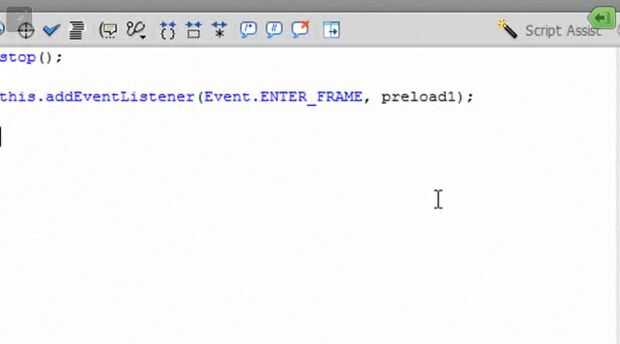 Asegurándose de que el primer fotograma de la capa inferior se selecciona en el panel Línea de tiempo, golpeó a F9 para abrir el panel acciones. En la primera línea, escribir un guión de stop que detiene la página web de ciclismo. Pulsa Intro para saltar a la siguiente línea y agregar un script que asigna una función de eventos a la página web. Llame a la función preload1. Pulsar intro.
