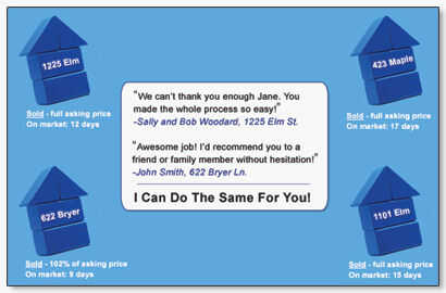 Testimonios añade legitimidad a la postal. Después de todo, estos clientes viven en la misma zona que los destinatarios de la postal. Así que vamos a añadir otra cita!