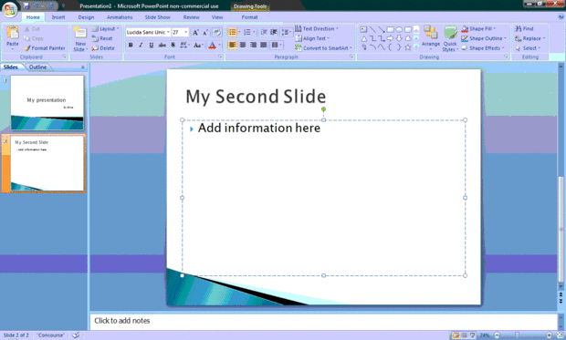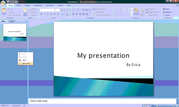 Las ocasiones son, usted va a necesitar más de una diapositiva. Hay algunas maneras que usted puede añadir más diapositivas. Observe que hay un área separada a la izquierda de la pantalla donde se encuentra su primera diapositiva. La primera forma de agregar una diapositiva es el área en donde se encuentra su primera diapositiva con el botón derecho y seleccione 'Nueva diapositiva'. Aparecerá una nueva diapositiva. La segunda manera de agregar otro que haga clic en "Nueva diapositiva" Deslice la barra de herramientas sobre las diapositivas. Este botón se divide en dos partes. La parte superior inserta una nueva diapositiva con un diseño predeterminado. También puede hacer clic en la parte inferior de la mitad de este botón, que le permitirá elegir el tipo de diseño que desee. Usted puede elegir una diapositiva con dos cuadros de texto y un título, un cuadro de texto, sólo un título y muchas otras opciones. Usted verá su nueva diapositiva aparecen a la izquierda bajo el primero, convertido así en la diapositiva grande que se puede editar. El diseño que escogió antes habrá trasladado a esta diapositiva. El diseño se trasladará para el resto de las diapositivas que crear a menos que decida cambiar uno solo, como se describió anteriormente. El diseño de pauta que elegiste aparecerá, y entonces puede agregar su información.