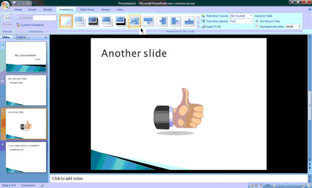 Para agregar transiciones entre las diapositivas, haga clic en la ficha 'Animaciones' en la parte superior de la página.  Aquí puede desplazarse por todas las opciones de transiciones y se ciernen sobre ellos para ver una vista previa.  Seleccione la diapositiva que desea que la transición que se aplica a y haga clic en la transición que usted eligió.  Usted puede hacer esto para cada diapositiva, seleccionar las transiciones igual o diferentes.