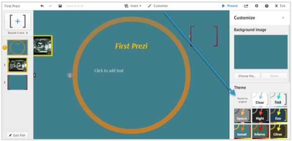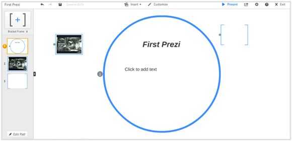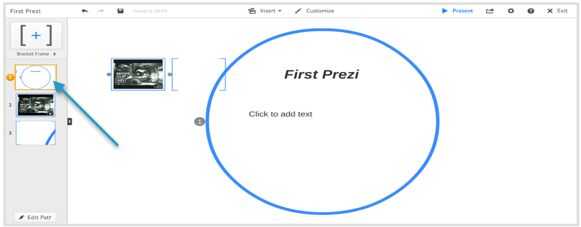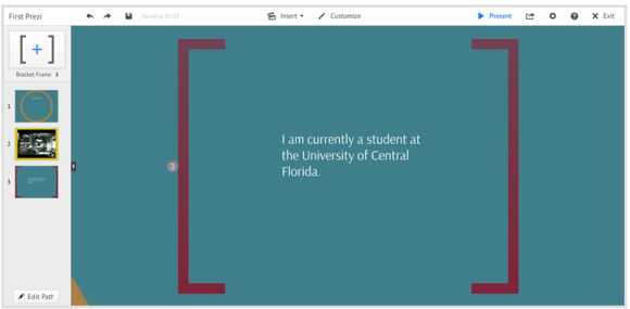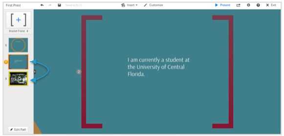 -La columna gris del extremo izquierdo de la pantalla es donde llevar el control de todos sus marcos como usted podrá ver el camino que tomarían sus diapositivas en PowerPoint. Cuando usted comienza su presentación, el orden de en que los marcos aparecen es el orden en que deberían presentarse en.