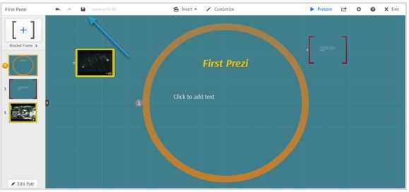 -Para guardar la presentación de Prezi, haga clic en el disco por encima de la tela abierta y en la izquierda de la etiqueta de "Insertar".